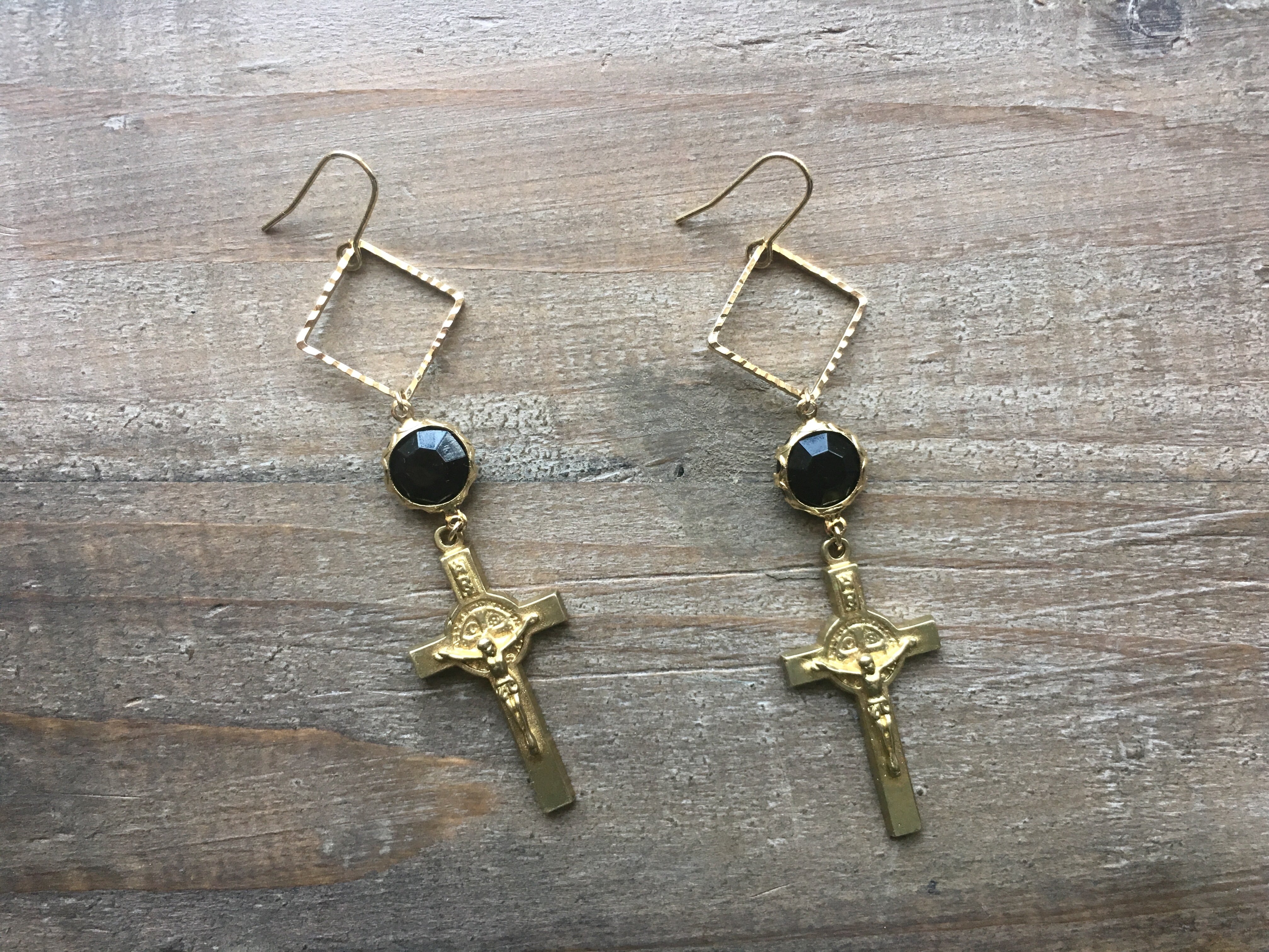 くすみ加工が元からされているヴィンテージ風のクロスチャームにブラックビジューを合わせたとてもおしゃれなデザインのピアスです。